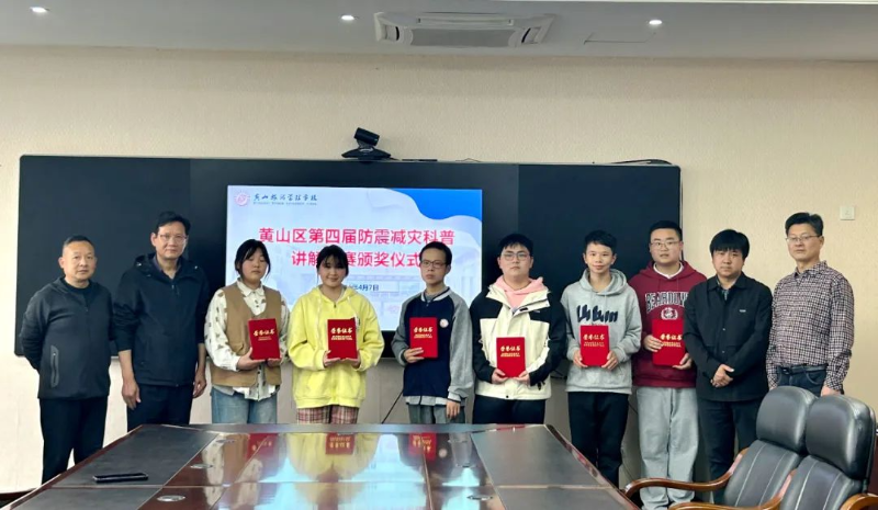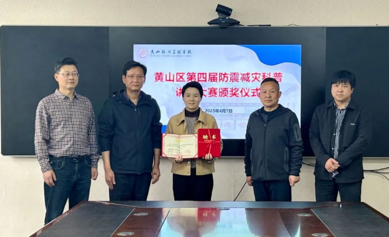 黄山区应急管理局与教育局相关负责人先后前往黄山区甘棠中心学校、甘棠小学、黄山二中、黄山旅游管理学校为获奖师生颁发荣誉证书及奖品,并对他们的创新实践和科普贡献表示充分肯定。本次大赛以“地震科普 携手同行”为主题,选手们各显神通,在市、区大赛中斩获佳绩。作为市级防震减灾科学传播师的旅校胡庆老师携其优秀作品《智能地动 抗震减灾新前沿》参赛,给大家带来了一堂新颖而深刻的科普安全课,甘棠小学的汪伟星同学以《地震中的生命守望者——卫星遥感技术》为题,讲述了新科技在防震减灾救灾过程中的作用发挥……15名选手通过情景演示、动画、专题讲演等多样化形式,生动地把晦涩深奥的科普知识讲得通俗易懂、趣味横生,展现了师生对科学普及的深刻理解。